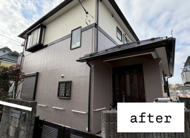| 府中市を拠点に塗装工事を行っている当社では、このたび東京都多摩市の戸建て住宅の塗り替え工事を行いました。 今回の現場では、屋根・外壁・付帯部・基礎まで、外装全体をしっかりとメンテナンスしています。 屋根はコロニアル屋根のため、まず下地を整えたうえでシーラーを丁寧に塗布し、下地との密着性を高めました。その後、遮熱効果に優れたサーモアイSiを使用して仕上げています。夏場の室内温度上昇を抑える効果が期待でき、耐久性にも優れた仕上がりとなりました。 外壁はサイディング外壁でしたので、下塗りにはパーフェクトサーフを使用し、細かな傷みや下地のムラをしっかりと補修。その後、耐候性・美観性に優れたパーフェクトトップで上塗りを行い、落ち着きのある美しい外観に仕上げています。 雨樋や破風板などの付帯部については、耐久性を重視し、シリコン系塗料で仕上げました。細かい部分まで丁寧に塗装することで、建物全体の印象が引き締まります。 また、見落とされがちな基礎部分もあわせて塗装を行い、外観の統一感を高めるとともに、建物を長く守るための施工を行いました。 府中市を中心に、多摩市・周辺エリアで戸建て住宅の塗り替えをご検討中の方は、ぜひお気軽にご相談ください。建物の状態に合わせた最適な塗料選びと、丁寧な施工を心がけております。 |
