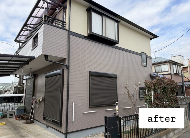 外壁はサイディング外壁でしたので、下塗りにはパーフェクトサーフを使用し、細かな傷みや下地のムラをしっかりと補修。その後、耐候性・美観性に優れたパーフェクトトップで上塗りを行い、落ち着きのある美しい外観に仕上げています。