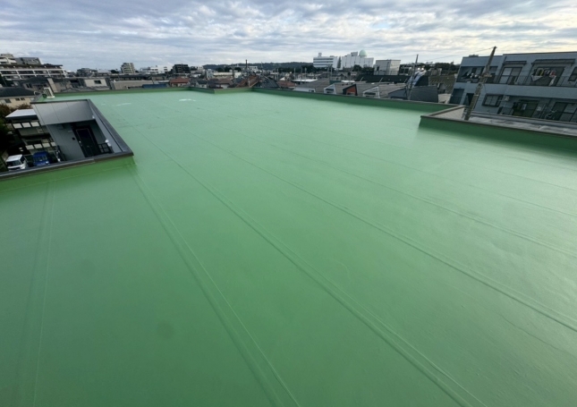 施工では、高圧洗浄により汚れをしっかりと除去し、 下地の状態を整えた後、専用のトップコート材を均一に塗布しています。 これにより、防水層を紫外線から守り、 防水性能を維持・回復させることができます。